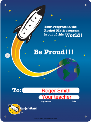 One of the most important benefits of Rocket Math is that it teaches students the value of hard work. By practicing orally with their partner each day, and doing the correction procedure properly, students find they can learn math facts to the level of automaticity–to where they can answer them instantly without thinking and without hesitation. That takes some practice and work, even for gifted students. But everyone can do it with enough practice. Although it is only ten minutes a day, the work of Rocket Math is very important in teaching students the value of their own efforts. Students learn that even if they can’t pass initially, if they practice every day (and maybe some more at home with a parent or sibling), they get to the point that they can answer those problems as fast as they can write. When they achieve this they are justly proud of themselves, because they know they earned the achievement through their own efforts. Learning this lesson is quite possibly even more important than the math facts themselves. This is an important lesson for life–that you benefit from working hard at something even if it doesn’t come easily.