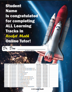Rocket Math will send this medallion* and a personalized certificate to any elementary student who completes ALL LEARNING TRACKS. We do not require students to go back to finish the two introductory learning tracks, (0.1) Counting & Subitizing and (1.0) Conceptual Addition but all 16 of the rest of the Learning Tracks are required.