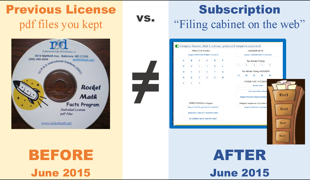 Something new. The website, the new programs and the subscription access plan are all new and represent a very significant investment on my part to create. I think it is a much better way to give access to my curriculum. It allows me to update, correct, improve, and expand the materials without having to make customers pay or even do anything to access those improvements. This has enabled me to devote full-time to developing Rocket Math curriculum and servicing my customers.