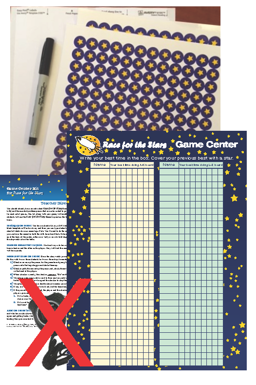 Everything you need** to set up an exciting and engaging Game Center in which students compete against themselves to beat their best time completing the Race for the Stars Game boards. Students time their partner completing the game board and post the time on the included poster using the included pen. A sheet of 60 computer-ready Avery name labels is also included. When students beat their posted personal best they put up the new time and cover the old time with a star sticker (plenty are included). A place for best times for both the A-K game board and the L-Z game board. Directions are included.