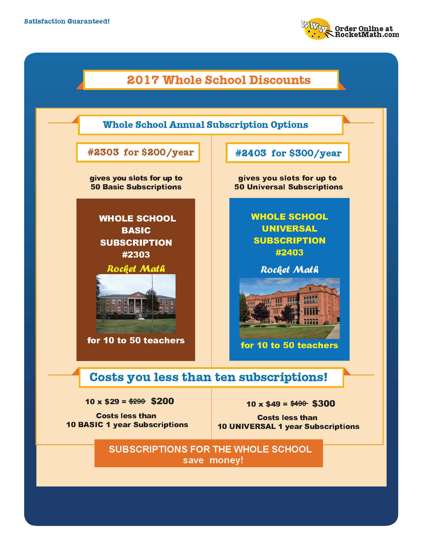 If you have several teachers in your school using Rocket Math, the Whole School Subscription is the way to go. Click the links to see more.